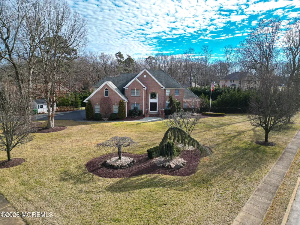 Exquisitely landscaped and impeccably maintained, this stunning four-bedroom brick colonial is nestled in the highly sought-after Plumsted Ridge neighborhood, offering timeless elegance paired with modern luxury. A custom wrought-iron entry door welcomes you into a grand open foyer, accented by decorative molding and nine-foot ceilings that flow throughout the home. Designed for both everyday comfort and refined entertaining, the spacious layout features a dramatic two-story living room with hardwood floors and a gas fireplace, a formal dining room ideal for hosting, a private home office, and an inviting family room with French doors that open seamlessly to an adjoining recreation room. The expansive eat-in kitchen is a chef's delight, showcasing granite countertops, a center island, double ovens, and ample space for gathering. A convenient first-floor laundry room completes the main level. Upstairs, you'll find four generously sized bedrooms, including a serene primary suite with a walk-in closet, sitting area, and a spa-inspired bath featuring a jacuzzi tub. A junior suite with its own walk-in closet offers added flexibility and comfort for guests or extended family. The professionally landscaped backyard is a true private retreat and an entertainer's dream. Enjoy al fresco dining on the paver patio with built-in BBQ area, relax by the tranquil waterfall of the heated saltwater pool, or take advantage of the volleyball court and bocce ball court for endless outdoor enjoyment. Lush, manicured grounds are maintained with a full sprinkler system. Additional highlights include a heated three-car garage and a fully finished basement offering exceptional bonus space, complete with a secondary living area, half bath, workout room, expansive playroom, and abundant storage. Equipped with smart home technology, a comprehensive security system, and a whole-house generator, this exceptional residence delivers modern convenience and peace of mind. Ideally located near Route 195, the Premium Outlets, and Six Flags, it perfectly balances luxury, privacy, and accessibility. This remarkable home truly has it all. Schedule your private tour today and experience everything this Plumsted Ridge gem has to offer.